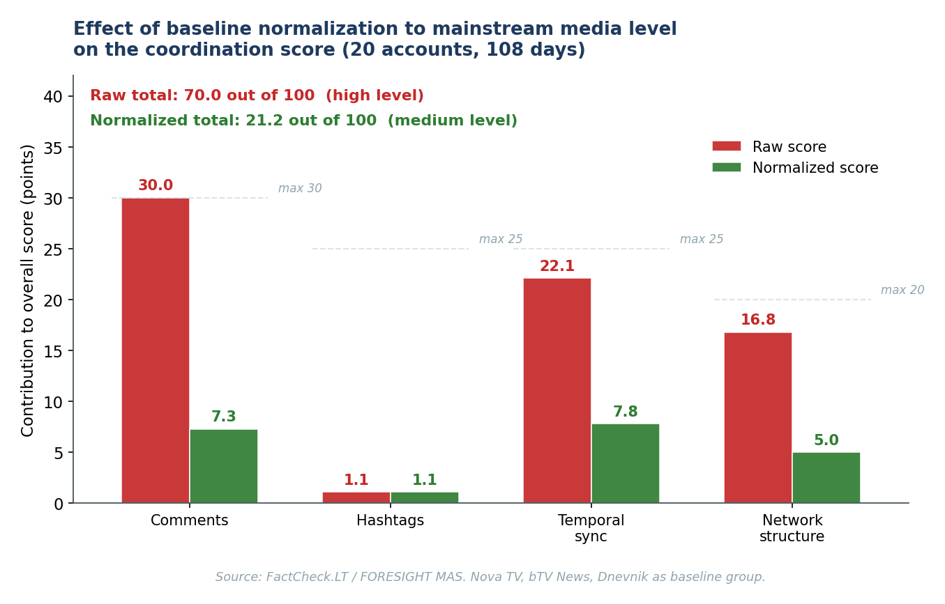 The necessity of normalization is explained as follows. Nova TV and bTV News, the two largest competing commercial television channels in Bulgaria, share 3,625 common commenters with a Jaccard coefficient of 0.1287. Any raw coordination score computed on a standard fifteen-to-twenty-account sample will automatically produce a high-alarm signal solely from this overlap of two mainstream audiences. On our sample, the raw score is 70.0 out of 100 (high level), the normalized score is 21.2 out of 100 (medium level). The difference between the two figures quantitatively reflects the contribution of the mainstream-television audience-hub effect to the raw coordination score.