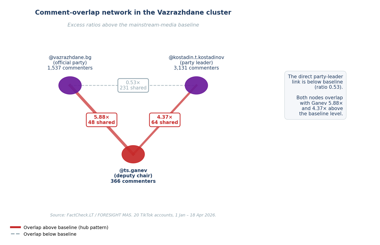The official Vazrazhdane party account with Ganev’s account yields a coefficient of 5.88 relative to baseline (48 common commenters). Party leader Kostadinov with Ganev shows a coefficient of 4.37 (64 common commenters). At the same time, the direct connection between the official party and its leader, Vazrazhdane ↔ Kostadinov, yields a coefficient of 0.53 (231 common commenters). Despite a substantially larger number of common commenters in absolute terms, the density of audience overlap between the party and its leader turns out to be below the mainstream-media baseline.