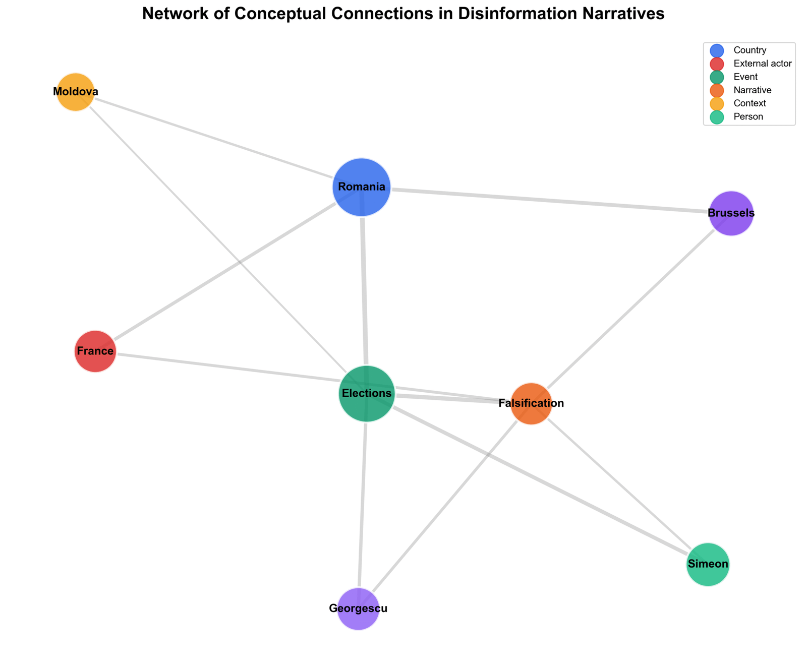 Persistent connection between concepts “Romania”, “falsification”, and “external forces”