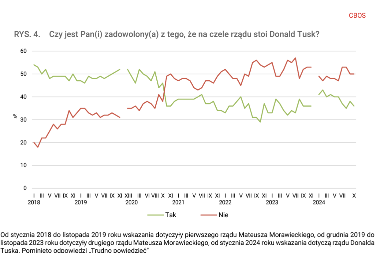 A detailed article about the October survey conducted by the Fundacja Centrum Badania Opinii Społecznej (CBOS) was published on October 25, 2024, by the largest Polish news agency Polska Agencja Prasowa (PAP). Chart from the official CBOS press release: Are you satisfied with Donald Tusk being head of government?