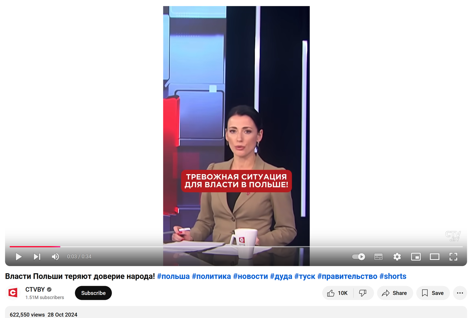 On October 28, a short video with a clickbait title “Polish authorities are losing people’s trust! #Poland #politics #news #Duda #Tusk #government #shorts” was posted on the YouTube channel CTVBY. This video gathered over 620,000 views in four weeks, containing the following statements:
