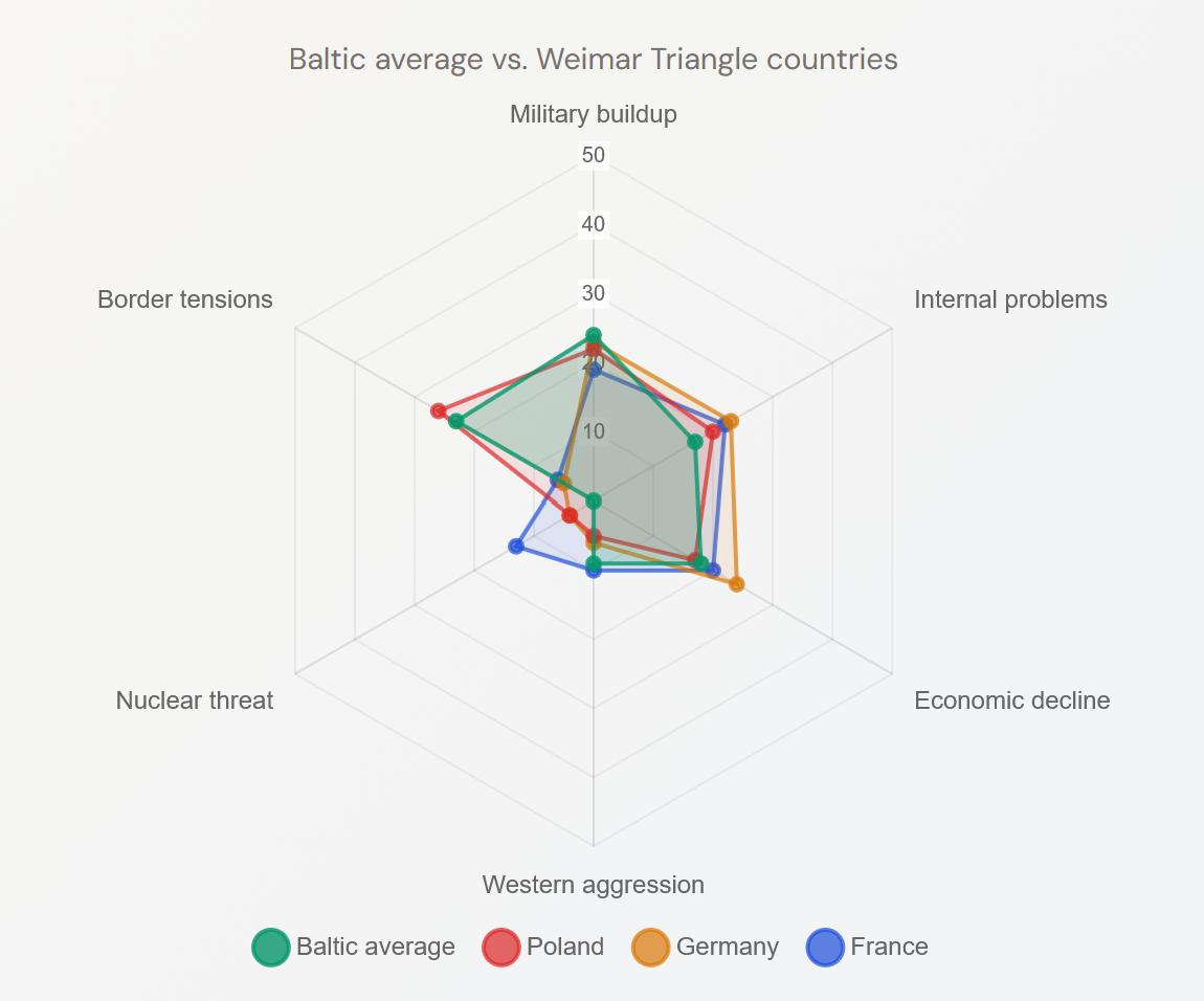 Each country has a distinct propaganda profile. Baltic states face a monotonal military threat; Weimar Triangle countries are attacked through individual vulnerabilities.