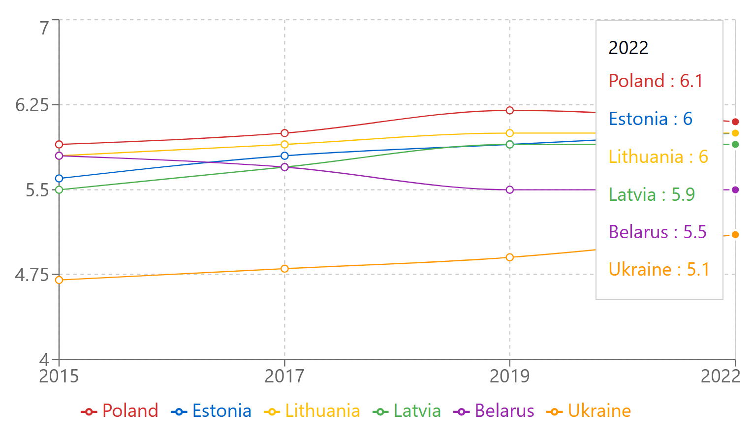 • Belarus shows a decline from 5.8 to 5.5