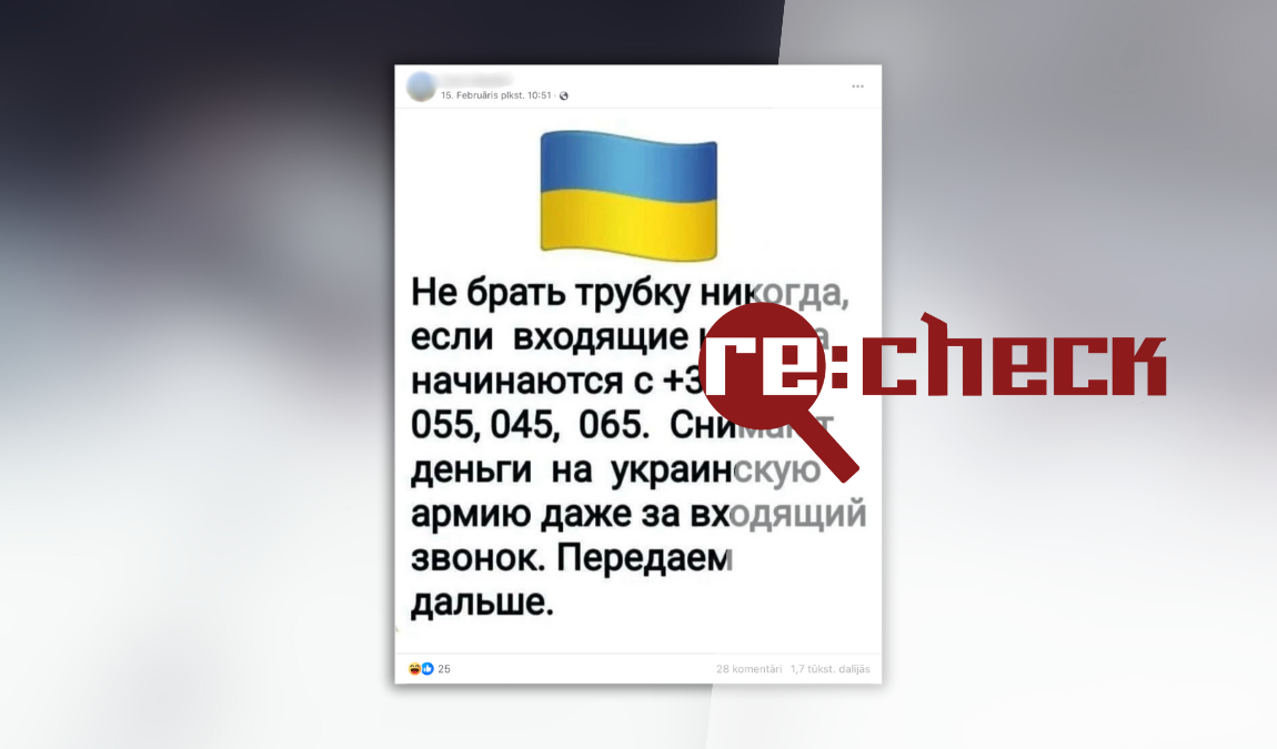 Fact-checkers from Re:baltica reported that a message warning people in Latvia not to answer calls from numbers starting with +380, 055, 045, 065, claiming that even incoming calls would be charged to benefit the Ukrainian army, is fake. Such a warning with a suggestion to pass it on was published on social networks in Latvia. It is most likely a fake news story created in Russia.