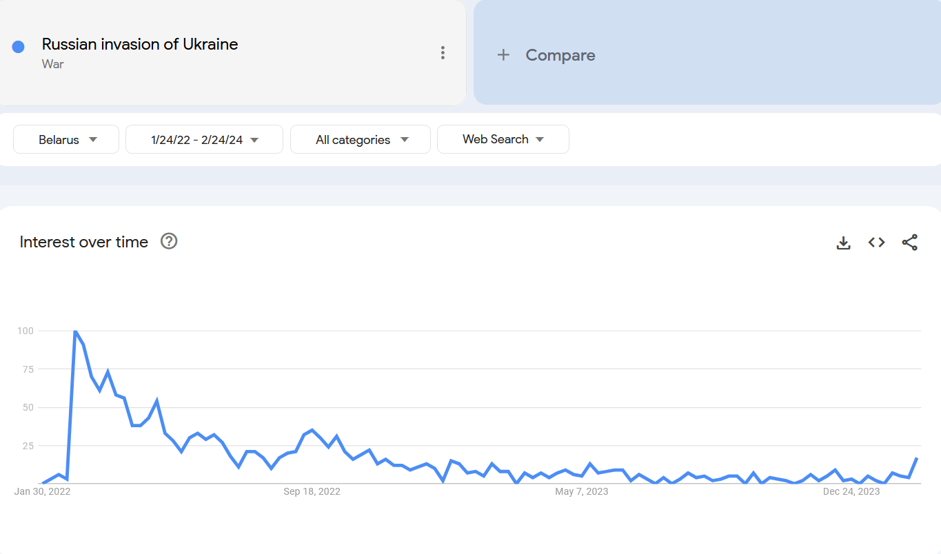 Looking at the Google Trends data over two years, the number of queries from the Belarusian internet audience, which is in the country, on the topic of the Russian-Ukrainian war has significantly decreased: