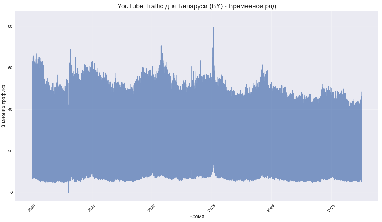 This research is based on the analysis of 23,500 data points about YouTube traffic in Belarus for the period from January 2020 to July 2025. The data was collected through the official Google Transparency Report API, which provides information about the share of YouTube traffic relative to the baseline level.
