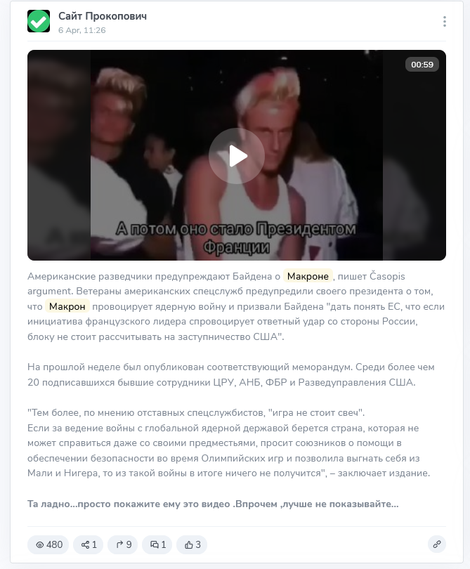 Можно предположить, что Эммануэль Макрон подвергается регулярным дезинформационным нападкам со стороны беларуской пропаганды, которая активно работает в телеграм-каналах. Целью можно считать создание негативного образа президента Франции и дискредитации деятельности французского правительства и значение Франции на европейском континенте.