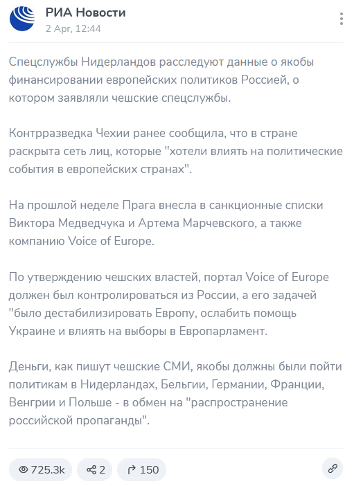 Де Кроо заявил, что бельгийское расследование было начато после того, как в конце марта чешские власти разоблачили пророссийские пропагандистские акции, проводимые онлайн-газетой Voice of Europe, которая даже платила европейским законодателям за продвижение пророссийской повестки дня.