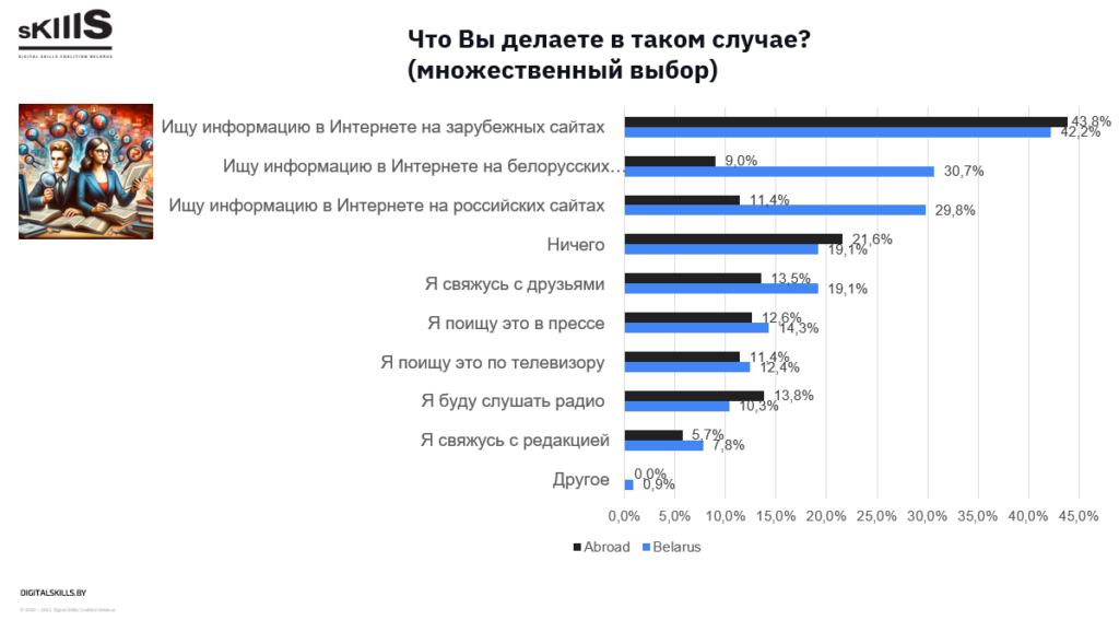 На основании данных исследования медиапотребления беларуской интернет-аудитории в стране и за рубежом, проведенного в сентябре-октябре 2023 года, по инициативе Коалииции по цифровым навыкам и Беларуской национальной платформой, рассмотрим ответы на два вопроса: