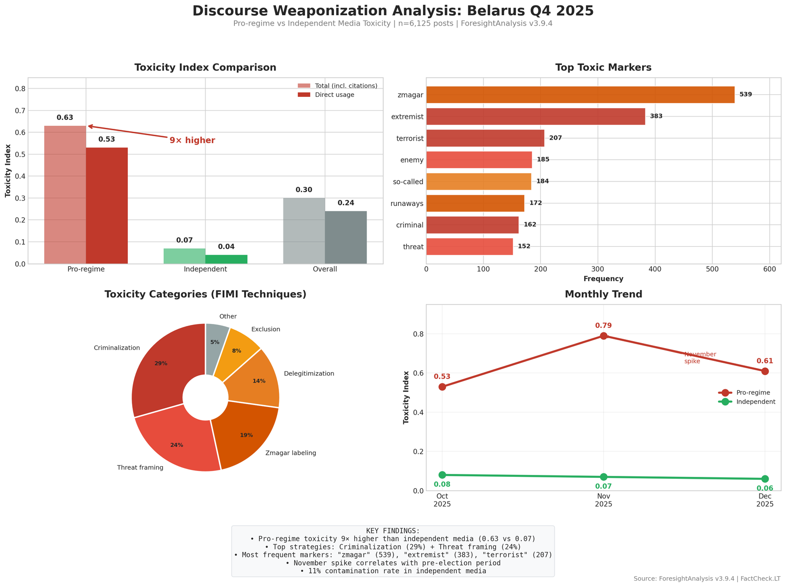 «Анализ 6,125 публикаций за Q4 2025 показал, что токсичность дискурса провластных источников (0.63) в 9 раз превышает показатели независимых медиа (0.07). Основные стратегии: криминализация оппонентов (29%) и конструирование угроз (24%).»