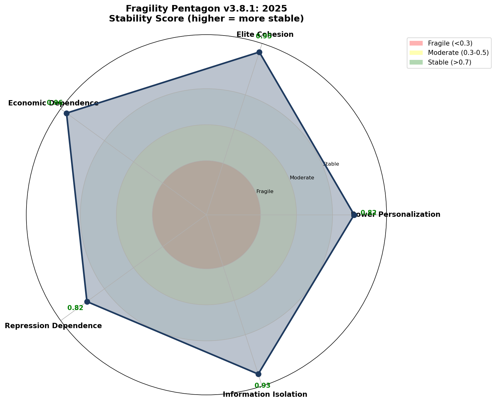 Индекс хрупкости оценивает устойчивость беларуской государственности по пяти измерениям на основе адаптированной методологии Fund for Peace, анализируя политическую легитимность, экономическую устойчивость, социальную сплочённость, безопасность и внешнее влияние.