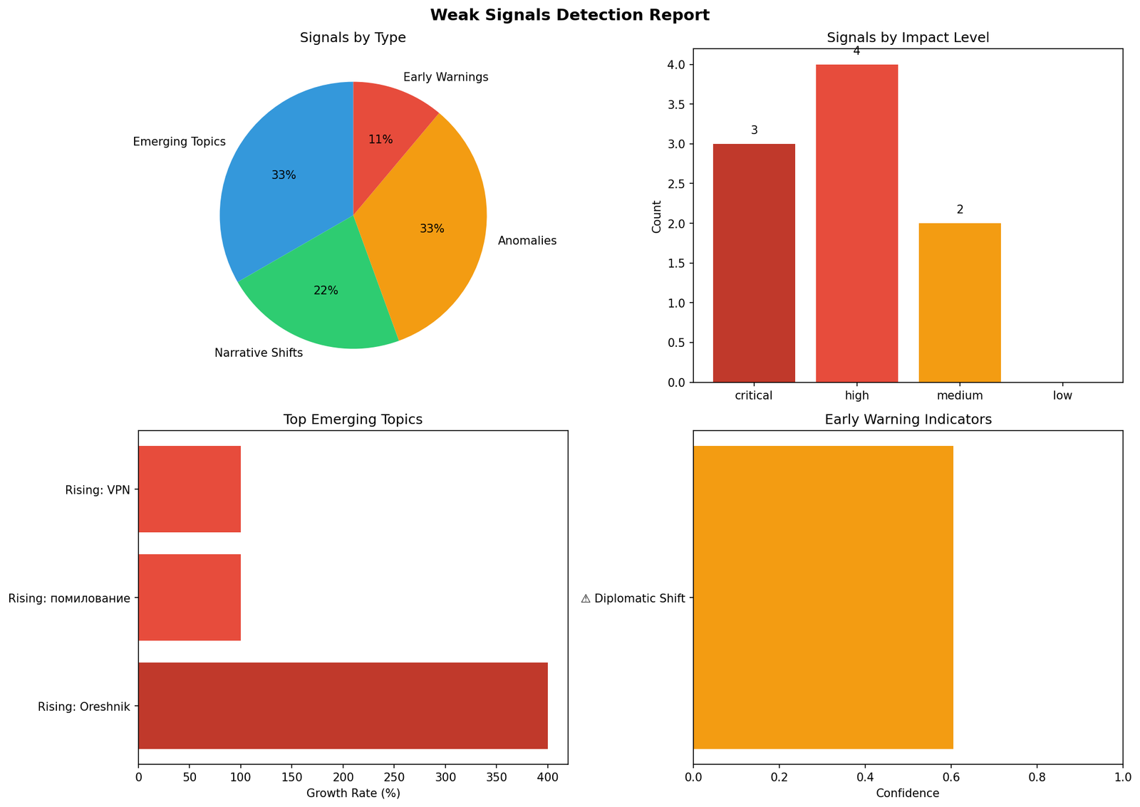 Помимо регулярного анализа, система включает механизм раннего обнаружения формирующихся трендов — детектор слабых сигналов. Это позволяет фиксировать новые темы, изменения в тональности существующих нарративов, аномальные паттерны и индикаторы возможных политических изменений до того, как они станут очевидны при ручном мониторинге.