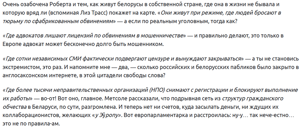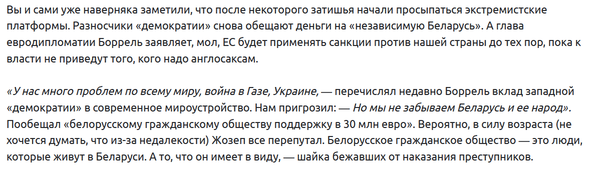 В целом, текст является примером российской пропаганды и дезинформации, целью которой является дискредитация оппозиционных фигур,создание негативного образа Запада и оправдание собственной политики и вмешательства в дела Беларуси.