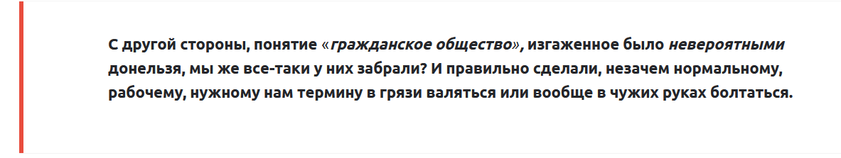 В самом тексте признается факт, что текущий режим начал использовать термин «гражданское общество» в своих целях, формируя «правильное» гражданское общество в их желаниях: