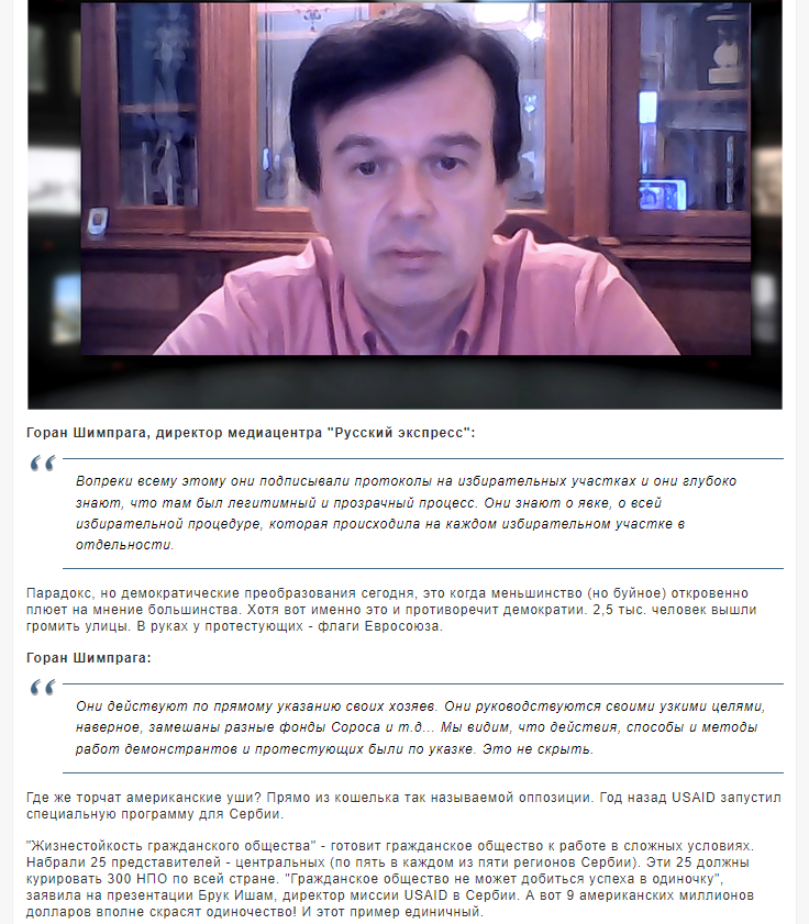 Автор утверждает, что события в Сербии являются частью заранее спланированных госпереворотов, организованных Вашингтоном и Брюсселем. Это классический пример теории заговора, используемой для объяснения внутренних конфликтов через внешнее вмешательство. Протестующие и оппозиционные движения характеризуются как марионетки в руках иностранных сил, что является способом дискредитации легитимных политических противников. Утверждения о вмешательстве западных стран и организаций (например, фондов Сороса) являются попыткой создать образ Запада как агрессора и манипулятора.