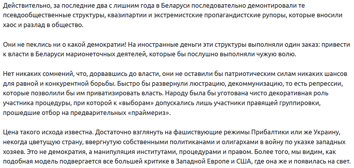 Текст представляет собой дезинформационное изложение политической ситуации в Беларуси, сильно сосредоточенное на поддержке действующего режима. Основной акцент сделан на важности внутреннего единства и сплоченности в ответ на внешние угрозы и геополитичесие вызовы. При этом многие из «угроз» представлены в искаженном виде.