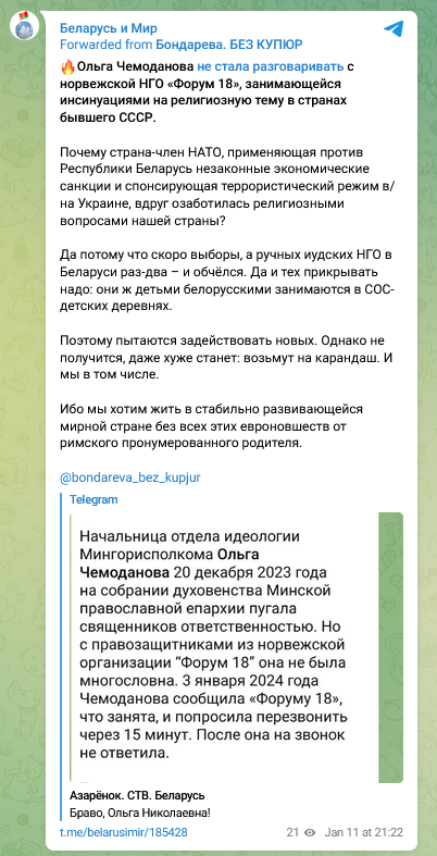 Форум 18 / Forum 18, крайне уважаемая в мире неправительственная организация, является партнером Норвежского Хельсинкского комитета, которая считает, что защита прав человека каждого, независимо от расы, вероисповедания, пола или сексуальной ориентации, является ключом к обеспечению безопасности и процветания для всех. Статья 18, Всеобщая декларация прав человека: Свобода мысли, совести и религии – включая право иметь или не иметь религию или убеждения – является поэтому одним из фундаментальных прав человека, необходимых для достоинства человечества, а также для справедливости и свободы для каждого.