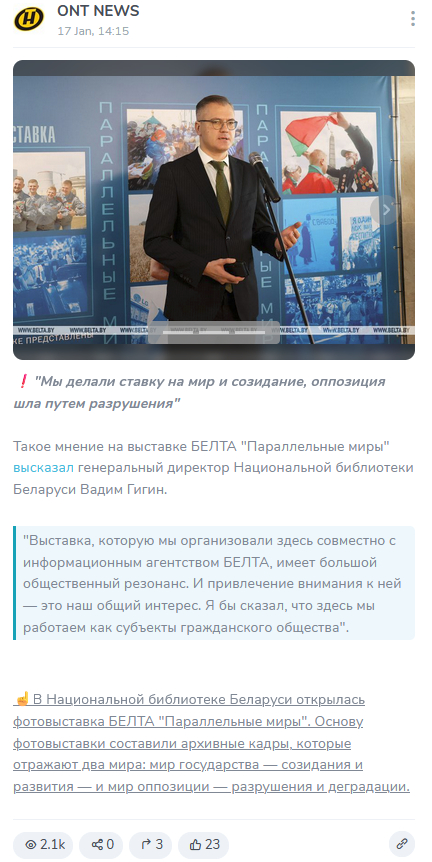 Продолжил заниматься дискредитацией оппонентов генеральный директор Национальной библиотеки Беларуси Вадим Гигин: «Мы делали ставку на мир и созидание, оппозиция шла путем разрушения»