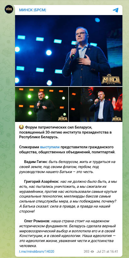 Заключительный пример, который демонстрирует высказывания трех ведущих государственных пропагандистов: В. Гигин, Г. Азаренок, О. Романов, формирующих культ личности текущего руководителя страны: