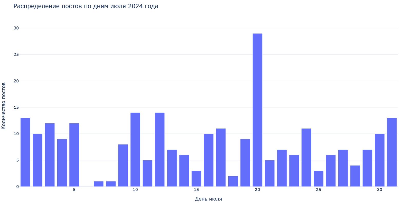 За июль было собрано 1019 сообщений, из 74 источников, 495 авторов. Затем была произведена очистка данных и сформирован окончательный датасет из 255 записей. Распределение их в течение месяца: