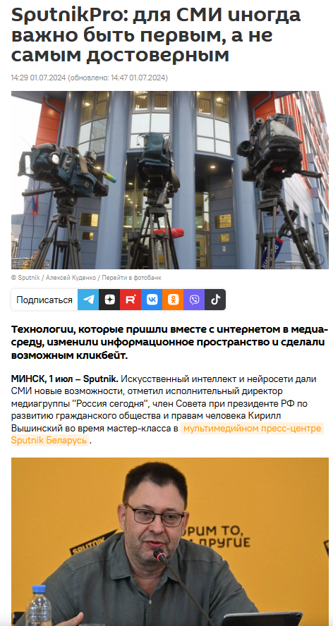 «Это все быстро позволяет монтировать, вырезать, выдавать, быть первыми… Это очень важная история, которая стала понятна еще в начале нулевых, и это, кстати, то, что привнес интернет… Иногда важно быть не самым достоверным, а важно быть первым», — отметил Вышинский.