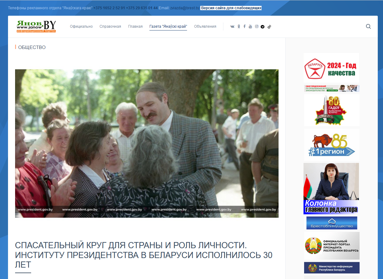 - **Дезинформация (Disinformation)**: Текст представляет односторонний взгляд на события, связанные с введением института президентства в Беларуси, акцентируя внимание на положительных аспектах и игнорируя негативные последствия, такие как подавление оппозиции, нарушения прав человека и отсутствие демократических выборов. Это создает искаженное представление о реальной ситуации в стране.