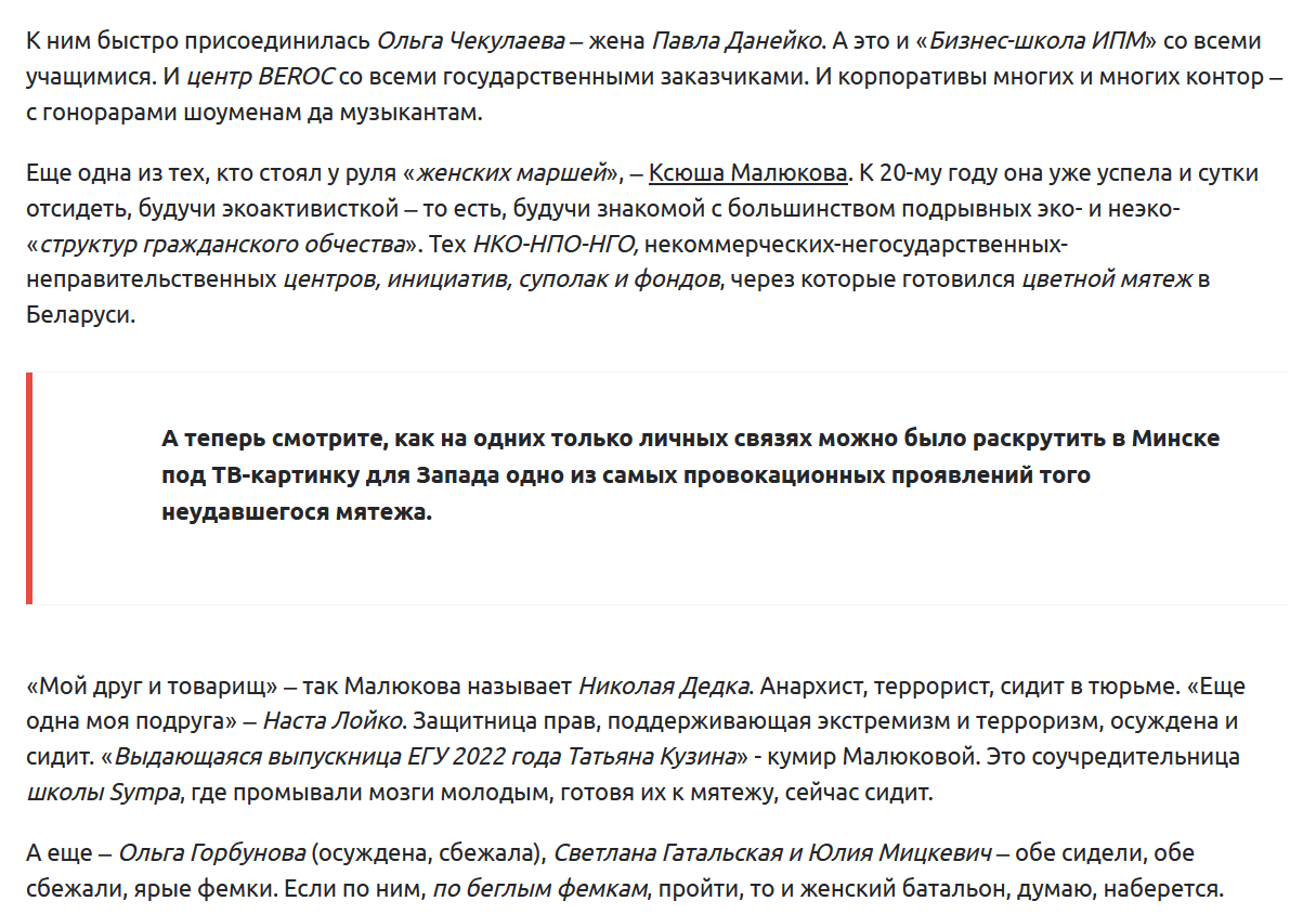 - **Doubt (Сомнение)**: Текст вызывает сомнения относительно легитимности и мотивов людей, упоминаемых в нем, таких как Анжелика Мельникова и Ксюша Малюкова. Автор называет их «экстремистками» и «террористами», что создает негативный образ и подрывает доверие к ним без предоставления убедительных доказательств.