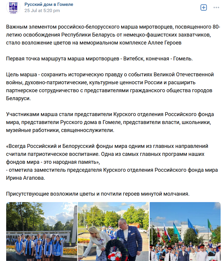 - **A — Audience** (Аудитория): Текст ориентирован на аудиторию, которая заинтересована в патриотическом воспитании и сохранении исторической памяти. Это может быть как местное население, так и более широкая аудитория, заинтересованная в российско-белорусских отношениях.