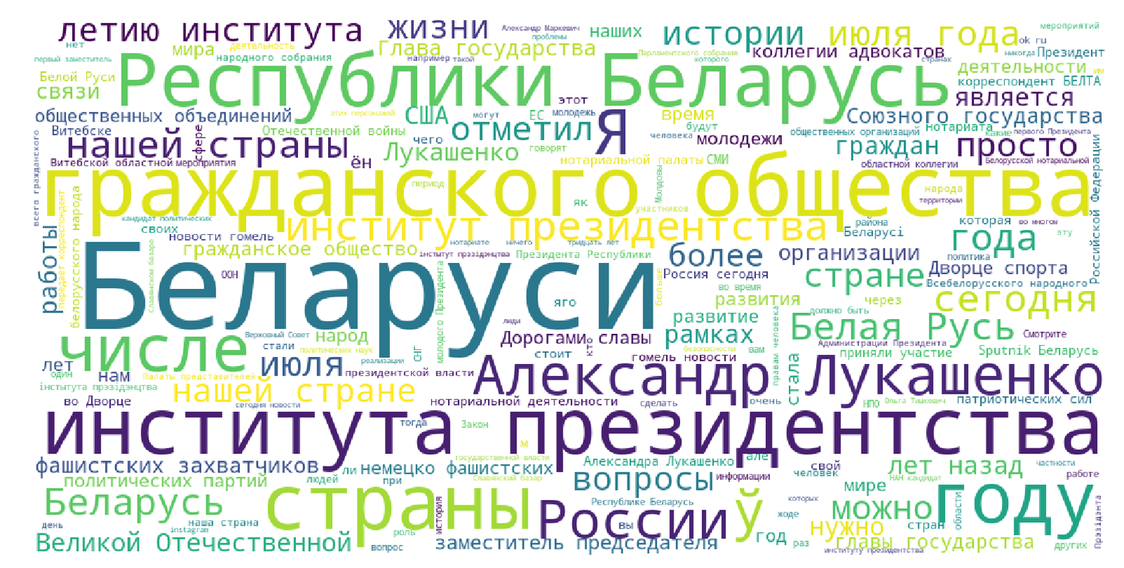 Видно доминирование темы «института президентства». Из названий организаций только заметна партия/общественная организация — Белая Русь.
