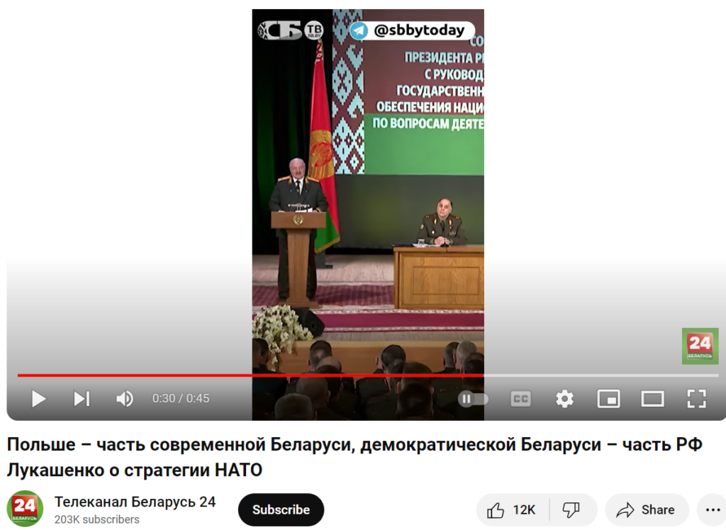 В одном видео человек в неуставной военной форме рассказывает о том, что стратегия НАТО передать Польше часть современной Беларуси, демократической Беларуси – часть Российской Федерации.