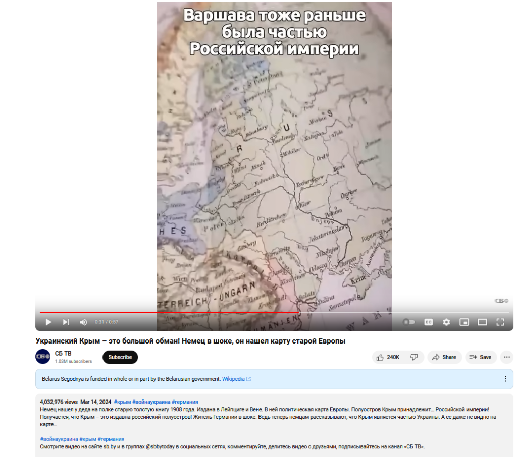Короткое видео, которое собрало более 4 миллионов просмотров, в котором рассказывается про карту 1908 года, изданную в Лейпциге и Вене. Главный нарратив, что на этой карте полуостров Крым принадлежит Российской империи.