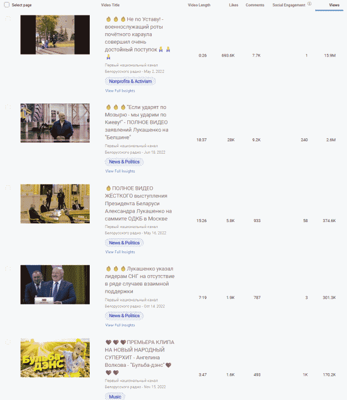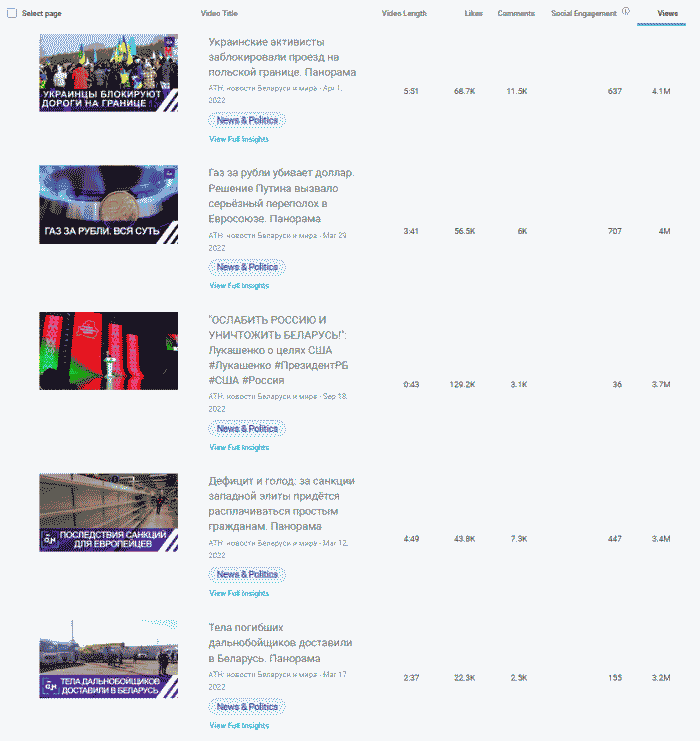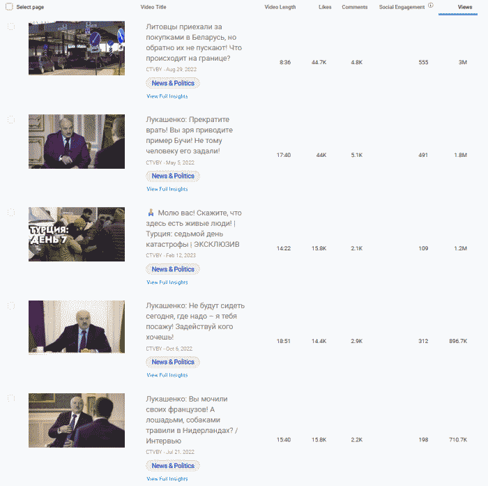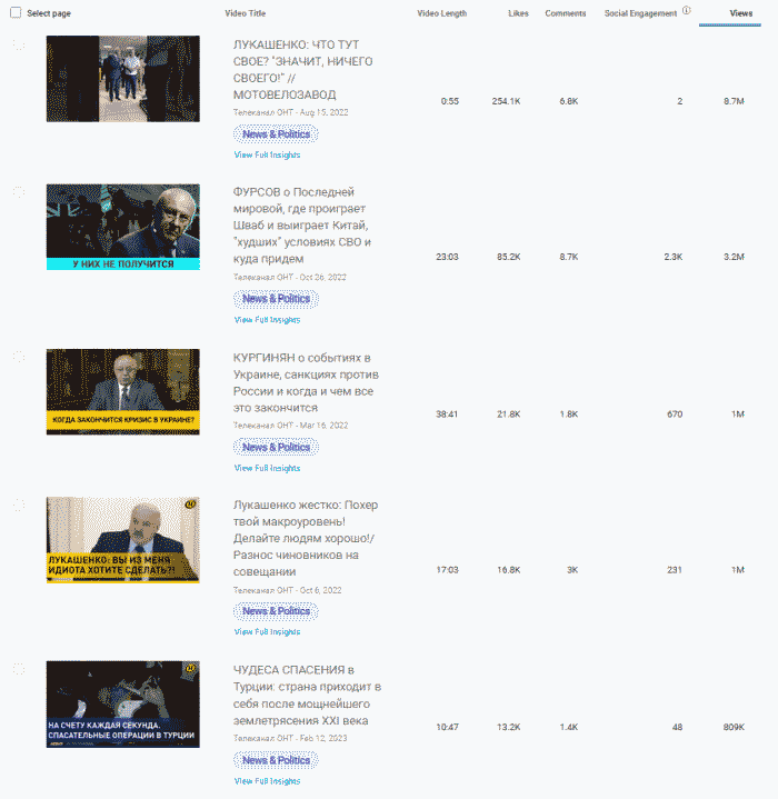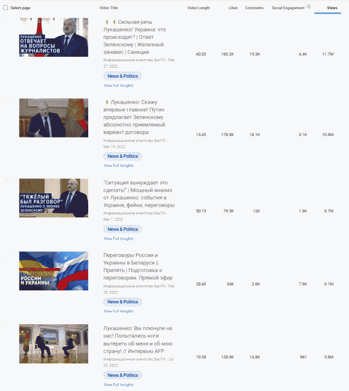 Лидер февральская речь 2022 года А.Лукашенко собрала почти 12 миллионов просмотров. Четыре из пять роликов-лидеров по просмотрам с ним и все пять связаны с российской военной агрессией и позицией Беларуси, как со-агрессора.