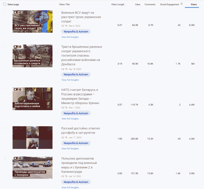 Здесь в лидерах мы видим дезинформационные нарративы, пришедшие из медиа Российской Федерации. Телеканал также лидер по числу размещенных видео.