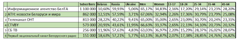 Из вышеприведенной таблицы видно, что бОльшая часть подписчиков, у изучаемых каналов, из Российской Федерации. У всех шести канало растет число подписчиков. Все каналы имеют преимущественно мужскую аудиторию подписчиков.