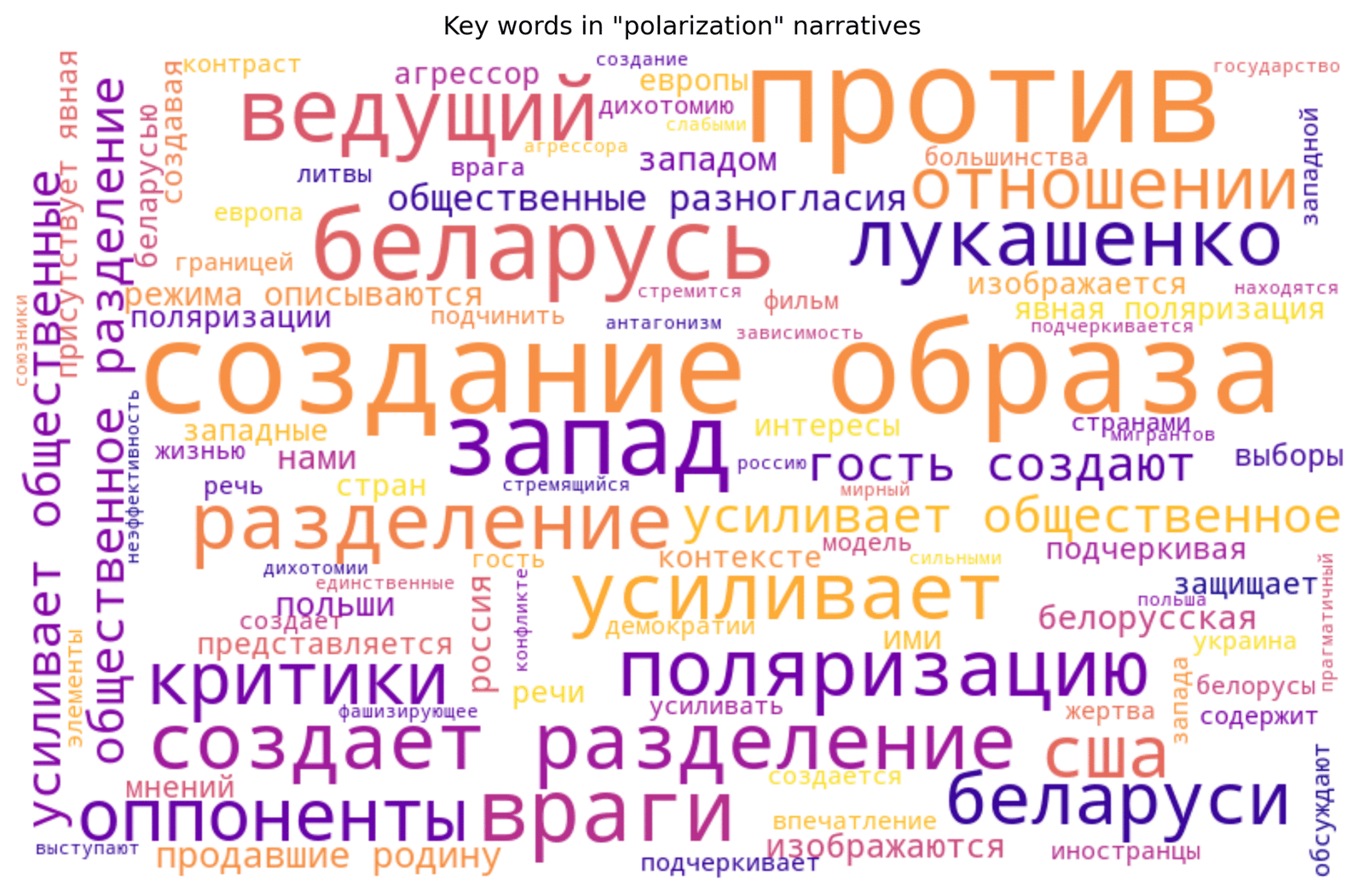 - Поляризация: фокус на «создание образа», «против», «разделение», «Беларусь vs Запад»