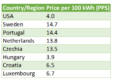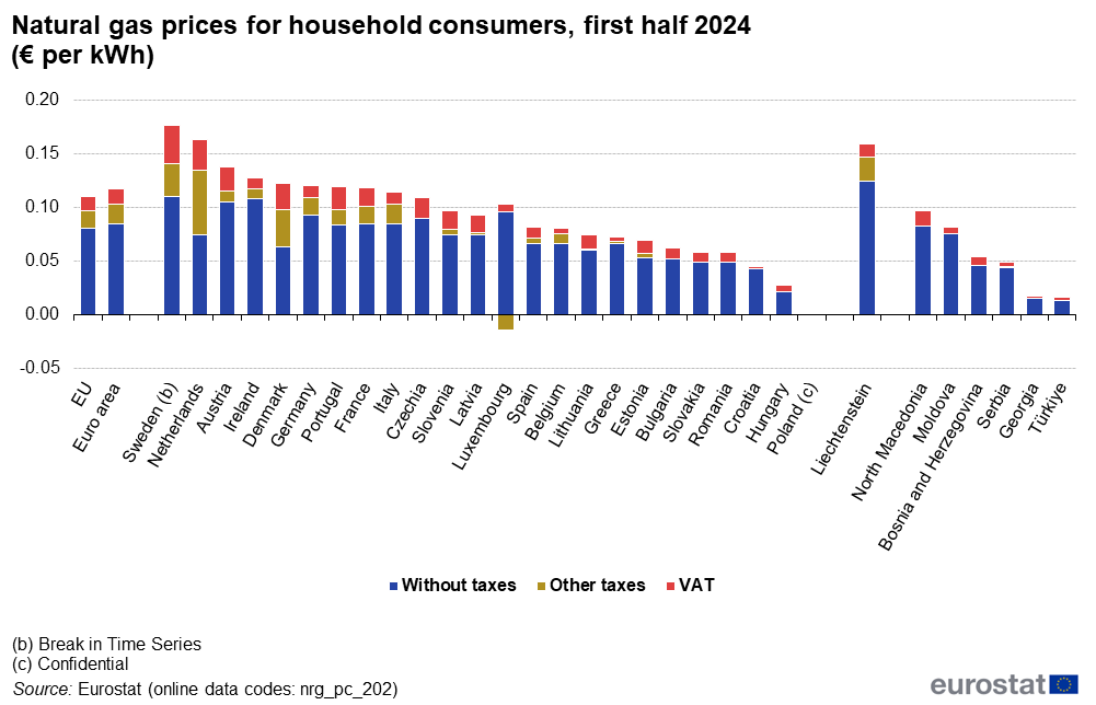 В первой половине 2024 года цена на природный газ для домашних хозяйств в США составила примерно $0.04 за киловатт-час (кВт·ч). В Европейском Союзе средняя цена находилась в пределах €0.1125 за кВт·ч, что эквивалентно приблизительно $0.12 за кВт·ч. В некоторых странах ЕС, таких как Швеция, Португалия и Нидерланды, цены достигали 13.5-14.7 единиц покупательной способности (PPS) за 100 кВт·ч, в то время как в таких странах, как Венгрия, они составляли всего 3.9 PPS за 100 кВт·ч (Источник: Natural gas price statistics)
