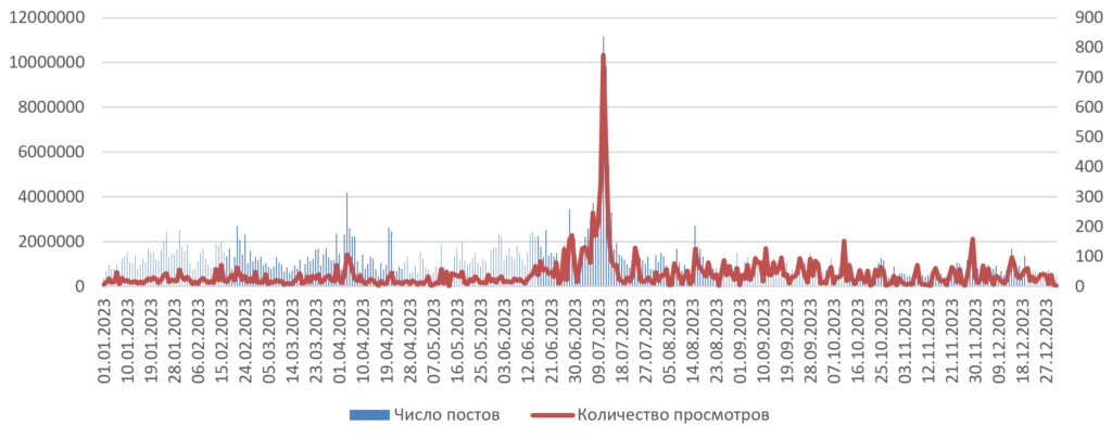 Наш анализ показал значительный пик в июле, который совпал с проведением высокоуровневой сессии НАТО в этом месяце, проходившей в Вильнюсе. Эта сессия вызвала интенсивное освещение в белорусских Telegram-каналах, особенно тех, которые имеют прогосударственную и токсичную направленность.