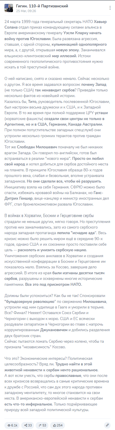 Среди собранного датасета большое количество (54) дезинформационных постов было связано с темой операции НАТО в 1999 году. Очень характерная публикация от главного беларуского библиотекаря, а также депутата* Палаты представителей Национального собрания Республики Беларусь — Вадима Гигина: