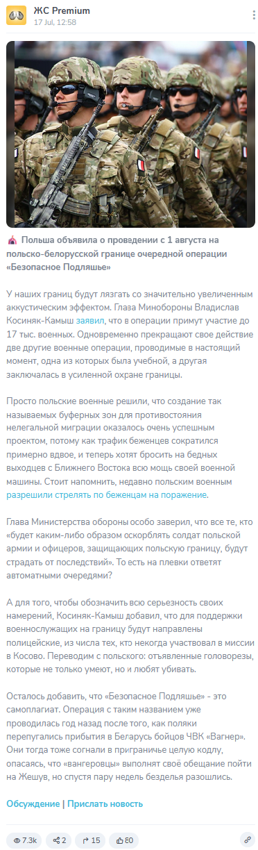 - «Операция ‘Безопасное Подляшье’ — это самоплагиат» — текст пытается высмеять и обесценить действия польского правительства, используя сарказм и утверждая, что они повторяются без смысла или цели. Это попытка дискредитировать усилия польских властей по поддержанию безопасности границ.