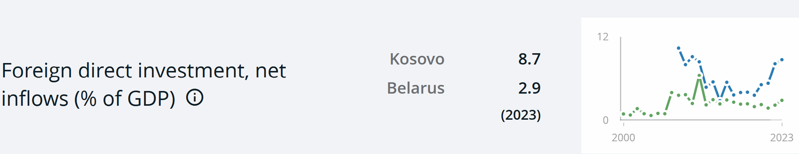 Прямые иностранные инвестиции в Косово показывают значительный рост относительно данного показателя в беларуской экономике.