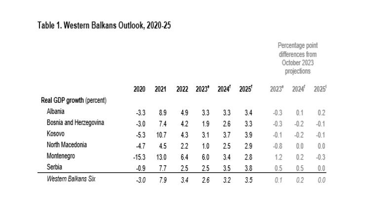 Последний Экономический отчет Всемирного банка по Западным Балканам прогнозирует рост экономики региона до 3,2% в 2024 году, с дальнейшим ускорением до 3,5% в 2025 году, что приближается к уровням до пандемии. Рост обусловлен стабилизацией международных цен, устойчивыми денежными переводами от диаспоры и увеличением инвестиций, особенно в Косово, где ожидается рост ВВП на 3,7% в 2024 году, что связано с продолжающейся стабилизацией международных цен, устойчивыми денежными переводами от диаспоры и постепенным увеличением инвестиций. Несмотря на положительные прогнозы, сохраняются риски, связанные с геополитической напряженностью, внутренней политической нестабильностью и ослаблением глобального роста.