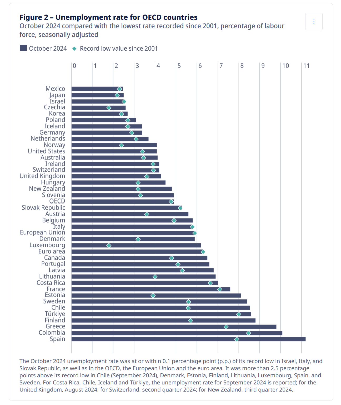Можно заметить, что уровень безработицы в Литве выше среднего значения по странам ОЭСР/OECD, но почему-то была выбрана именно Литва, а не к примеру, Эстония, где уровень безработицы в октябре 2024 был еще выше.