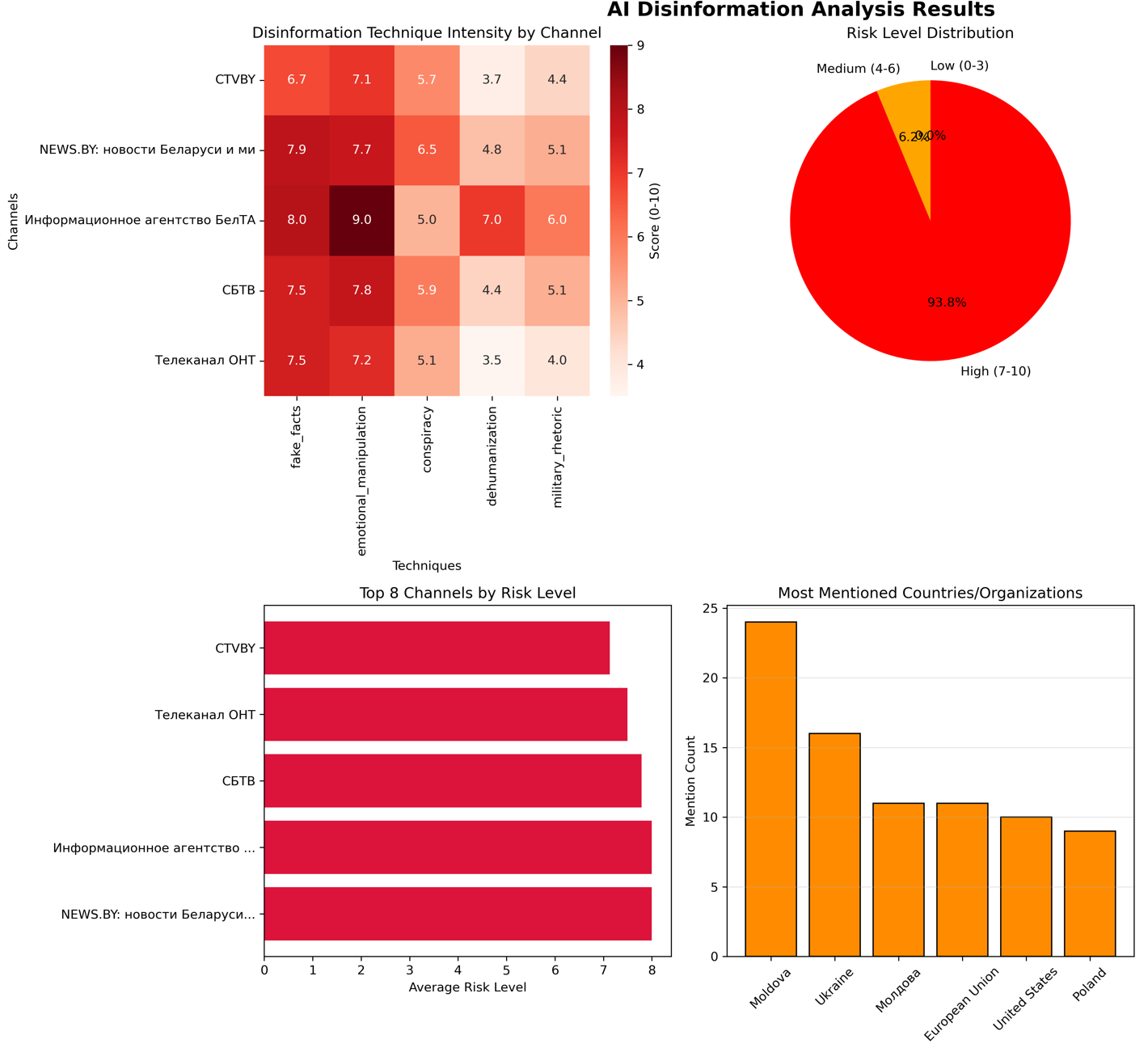Распределение контента по уровням риска оказалось критически асимметричным. Подавляющее большинство проанализированного материала — 93.8% — попало в категорию высокого риска дезинформации, что означает систематическое использование ложных утверждений, конспирологических нарративов и манипулятивных техник. Лишь 6.2% контента классифицировано как средний уровень риска, а материалов с низким риском не обнаружено вообще. Такая концентрация высокорисковых материалов указывает не на случайные ошибки в журналистской работе, а на целенаправленную информационную кампанию.