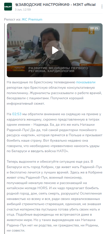 Или на официально канале ОАО «МЗКТ», производителе многофункциональных тягачей, делается перепост про родных главного редактора оппозиционного новостного ресурса Charter97: