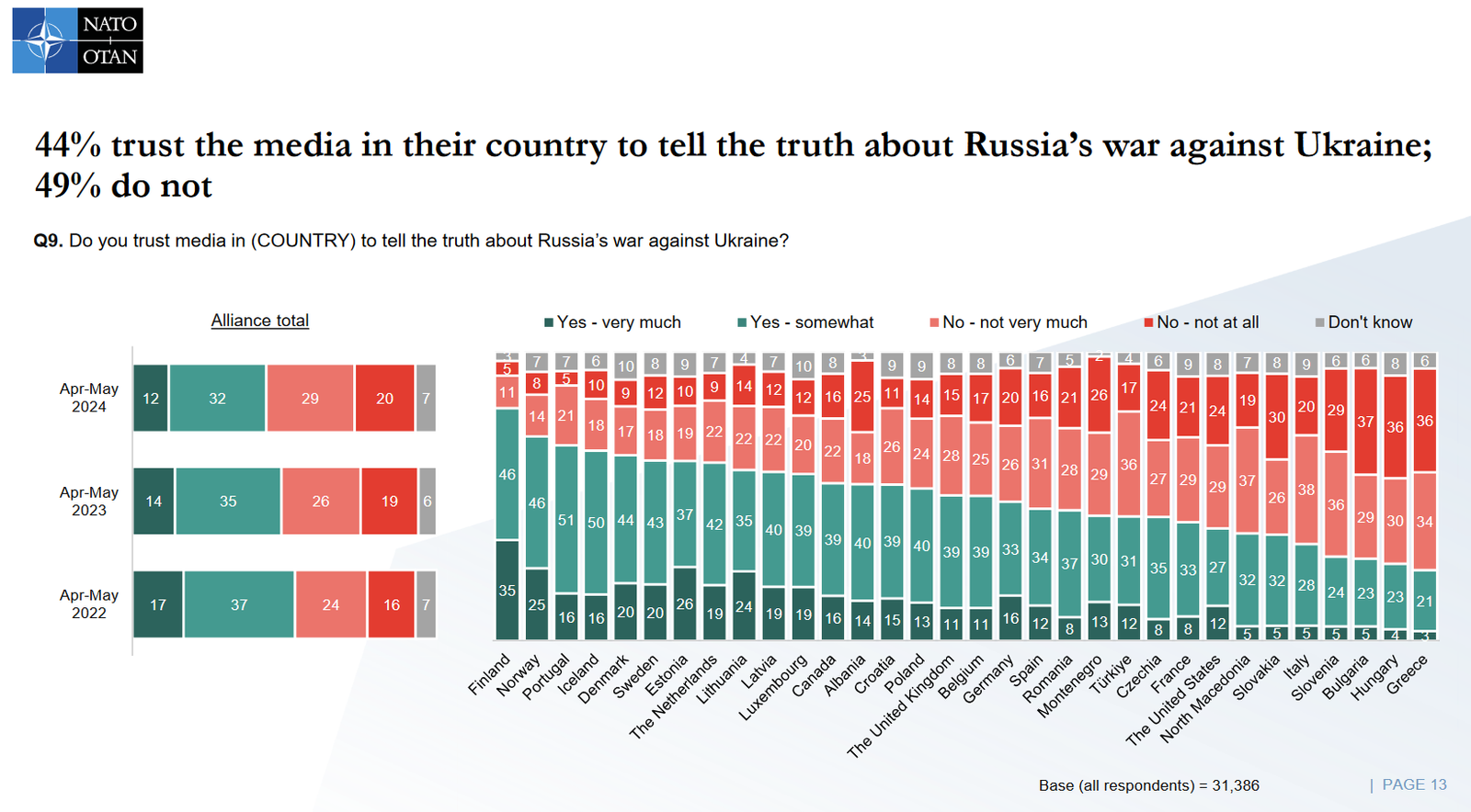 Как видно из результатов, на 9% уменьшилось число респондентов доверящих тому, как медиа освещают войну России против Украины. Это наглядный пример, как работает российская пропаганда распространяющая дезинформационные нарративы в различных странах, включая страны НАТО.