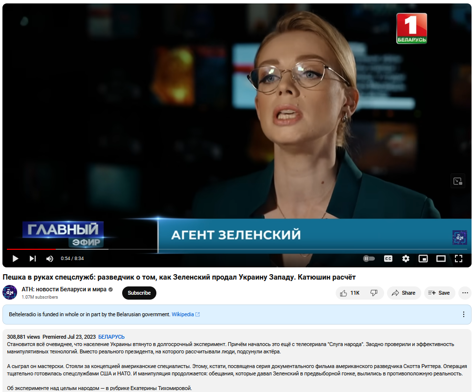 Июльский всплеск упоминаний связан с выходом специальной передачи на телеканале Беларусь 1: Пешка в руках спецслужб: разведчик о том, как Зеленский продал Украину Западу. Катюшин расчёт