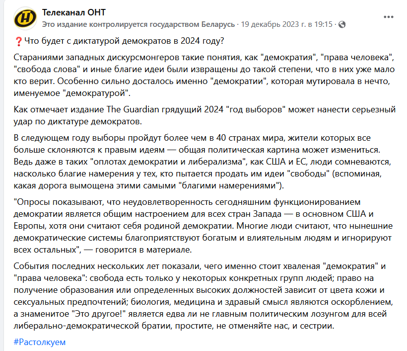 19 декабря телеканал ОНТ пересказал содержание статьи из The Guardian про выборы в 2024 году.