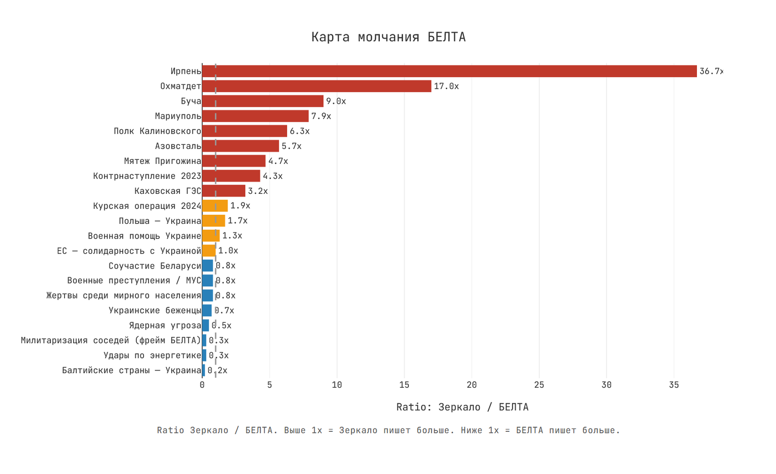 Детская больница «Охматдет», разрушенная российской ракетой в июле 2024 — 3 упоминания у БЕЛТА против 51 у Зеркала (разница в 17 раз). Буча, Мариуполь, Азовсталь — всё это существует в одном информационном пространстве и практически отсутствует в другом.