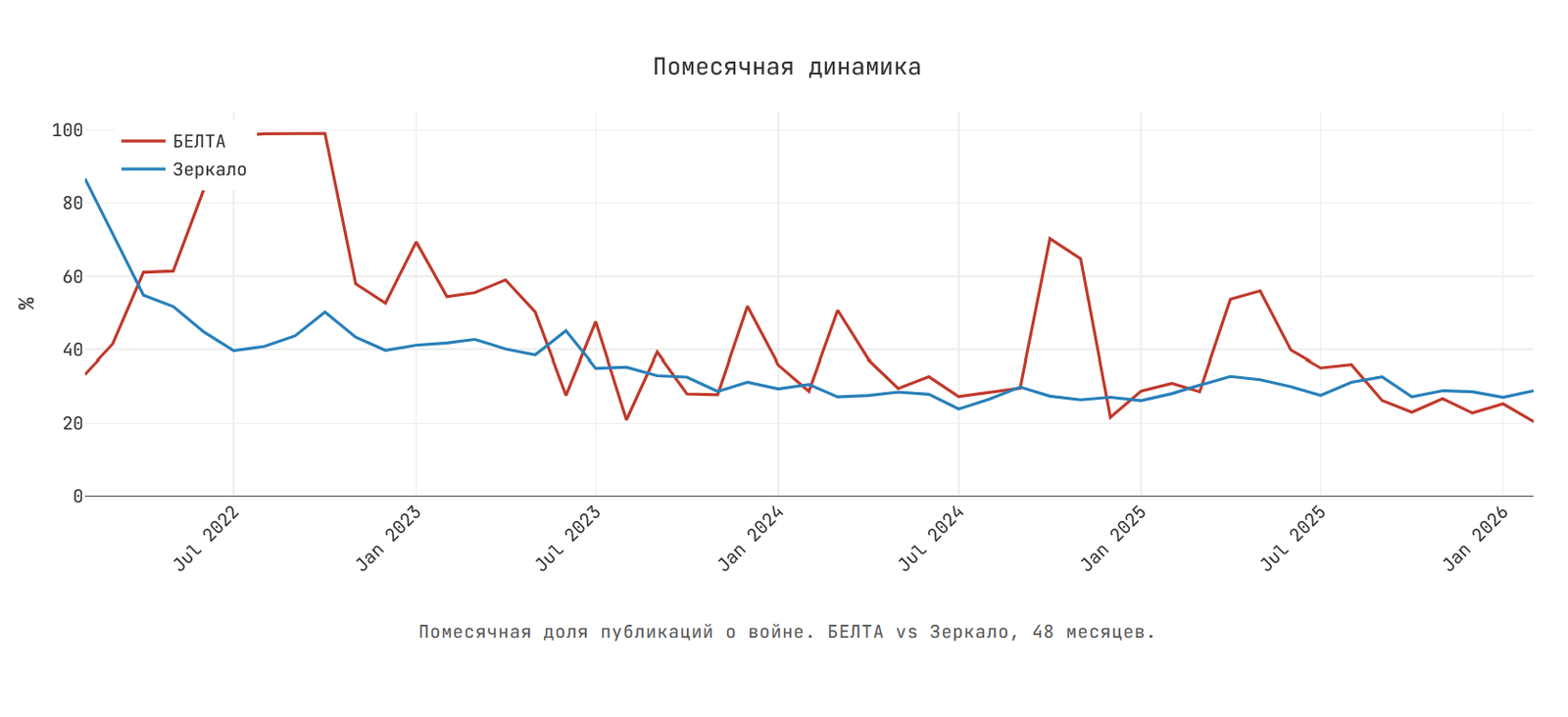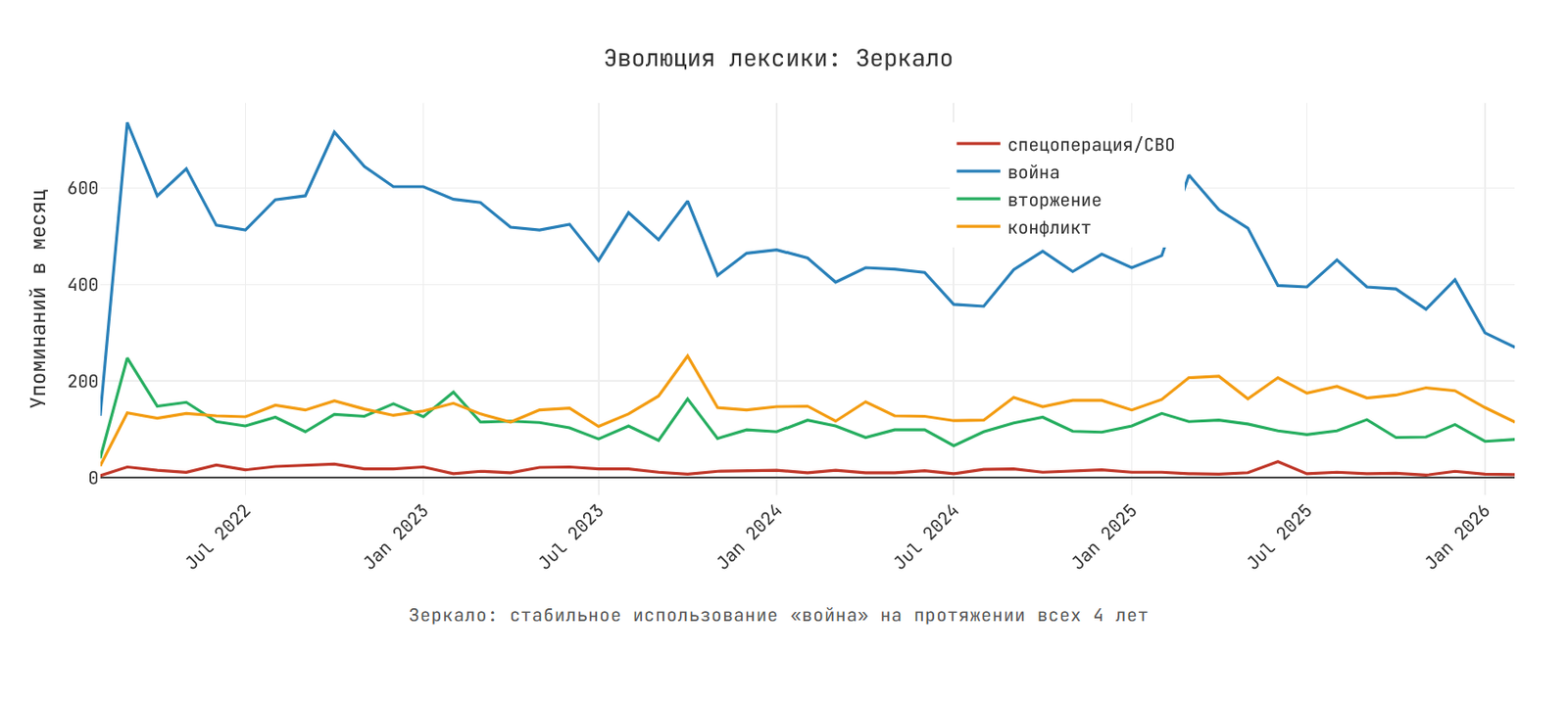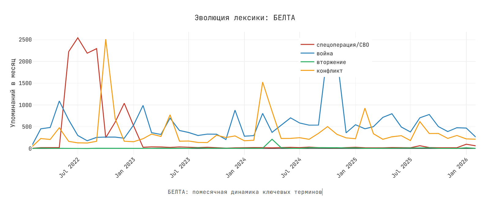 Динамика терминов во времени раскрывает механику лексических замен. В первые месяцы войны БЕЛТА активно использовала «спецоперацию» (до 2 500 упоминаний в месяц). К концу 2022 года этот термин был заменён на «конфликт». К 2024 году даже БЕЛТА была вынуждена перейти на слово «война» — но «вторжение» по-прежнему остаётся почти табу.