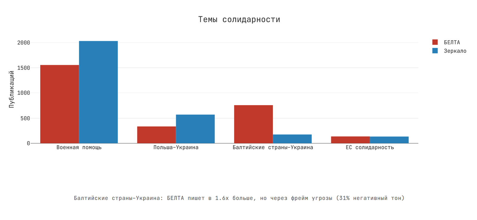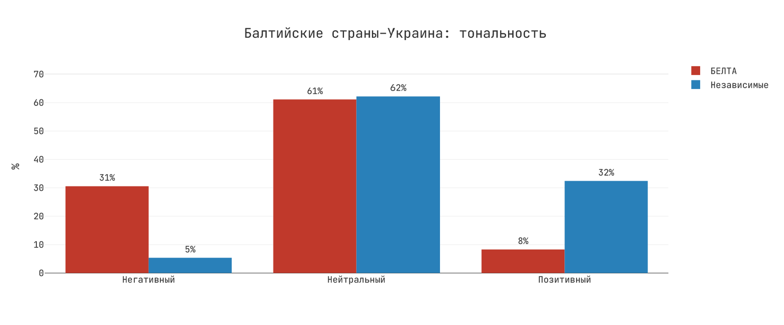 БЕЛТА пишет о связях Балтийских стран и Украины в 1.6 раза больше, чем все независимые вместе (756 vs 486). Но LLM-анализ показывает, что тон этих текстов принципиально иной: 31% — негативный (у независимых — 5%). Фрейм «proxy war» используется только БЕЛТА (8%) и полностью отсутствует у независимых.